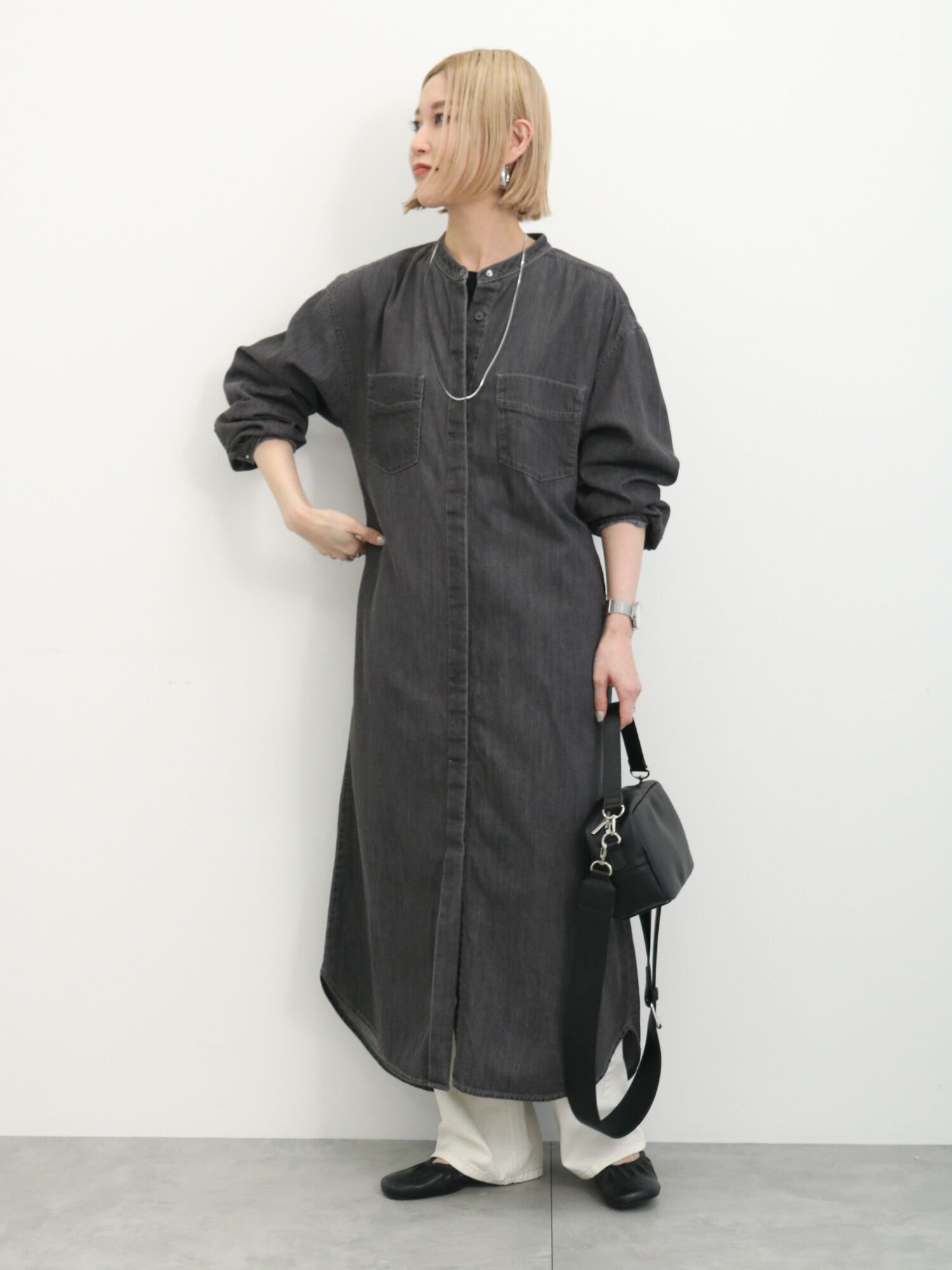 キナリ、チャコール、ブルーの3色展開がされているデニムシャツワンピースです。